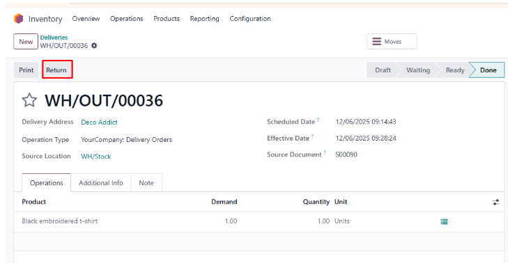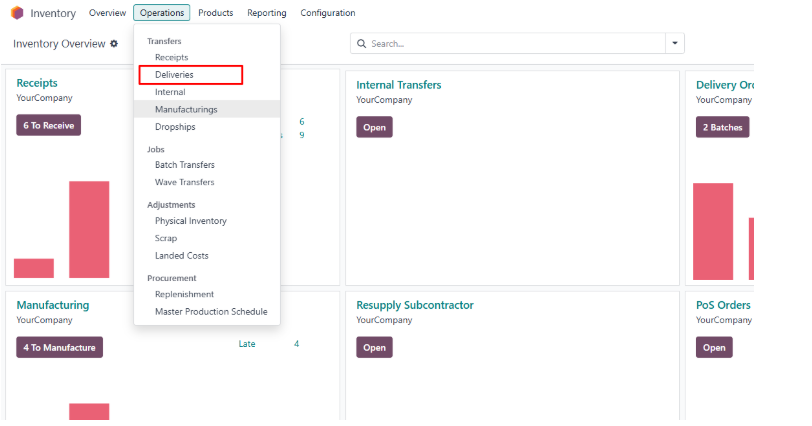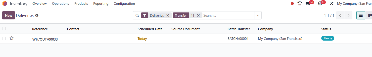 * To view the transfer, go to the Inventory dashboard and choose Delivery Orders.