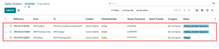 * In the Transfers window, you will see three delivery orders with details like Source Document, From, To, Status, and Company.