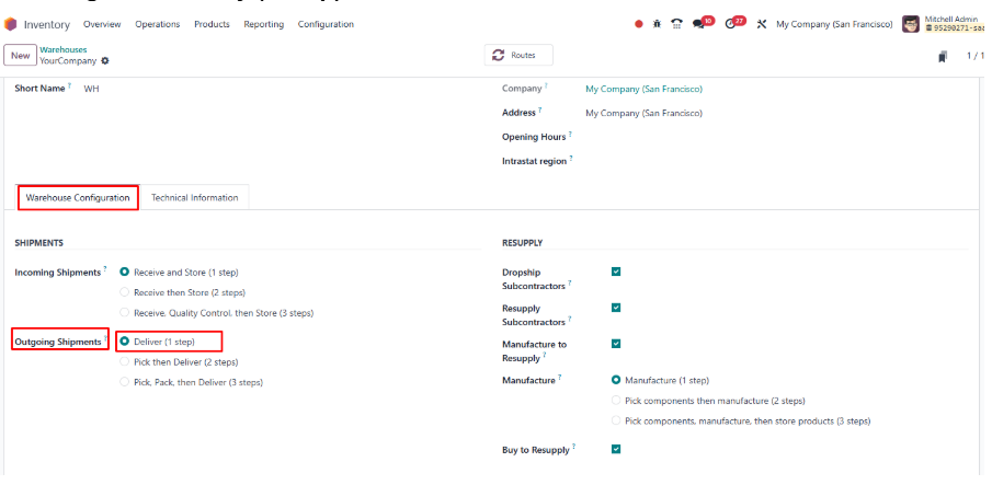 * In the Warehouse Configuration tab, under Resupply and Shipment details, the default outgoing routes appear in the Outgoing Shipments field.