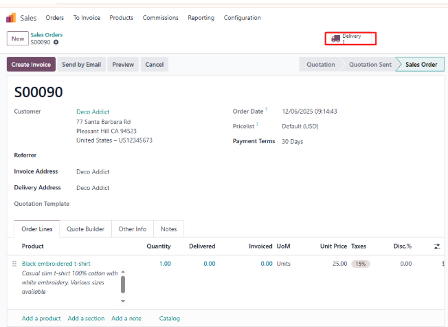 * Create a sales order by selecting the customer and adding a product under Order Lines. After confirming the order, click the Delivery smart button.